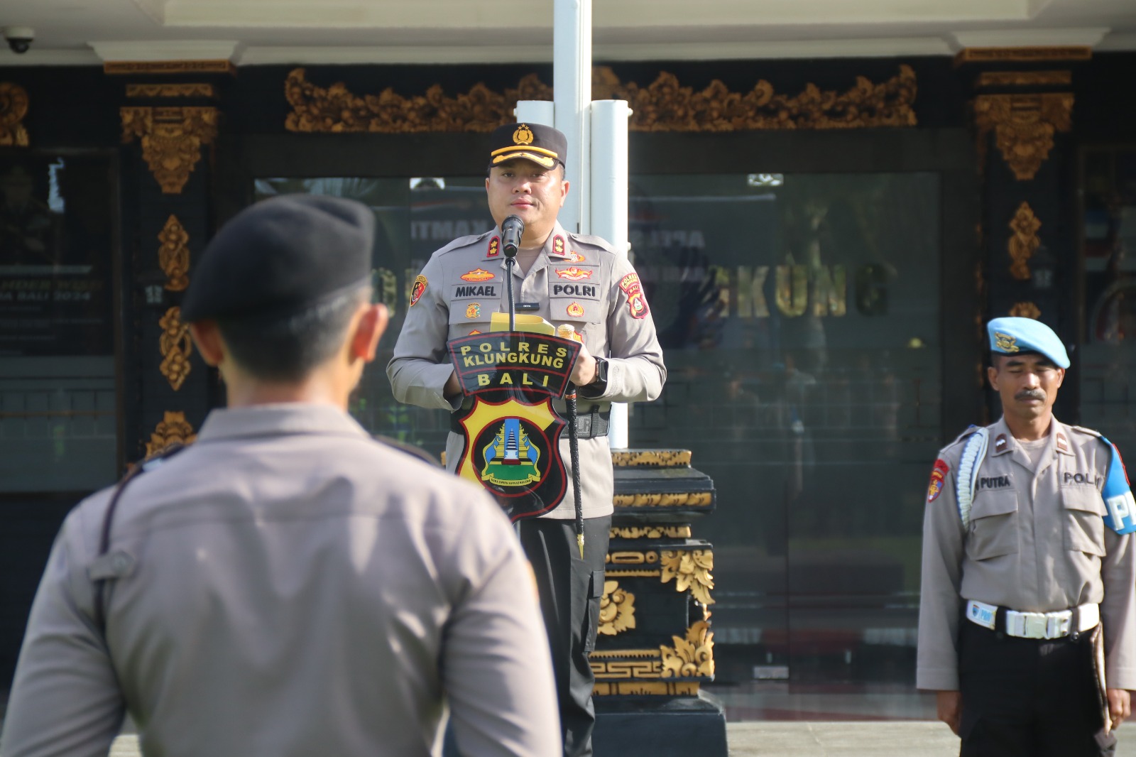 Apel dipimpin langsung oleh Kapolres Klungkung, AKBP Mikael Hutabarat, S.H., S.I.K., M.H., dan diikuti oleh unsur TNI-Polri serta instansi terkait, di antaranya personel Kodim 1610/Klungkung, Samapta, Sat Lantas, Sat Reskrim, Sat Intelkam, Sat Resnarkoba, Sat Polairud, gabungan staf Polres, ASN Polres, serta dukungan dari Dishub, Satpol PP, BPBD, Dinas Kesehatan, komunitas Bali Dwipa, dan pecalang.