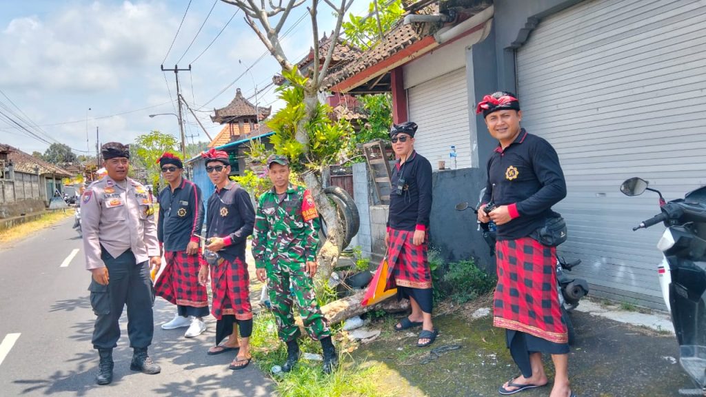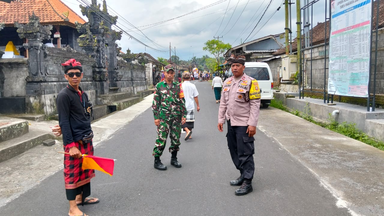Sinergi antara Bhabinkamtibmas, Babinsa dan pecalang terlihat solid dalam melaksanakan tugas, baik dalam pengaturan jalur kendaraan maupun pengamanan prosesi upacara.