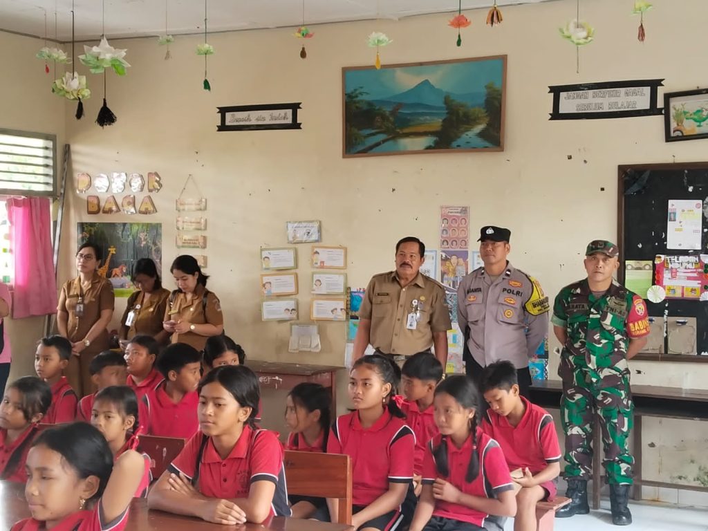 Polres Klungkung – Dalam rangka mendukung suksesnya program kesehatan bagi anak usia sekolah, Bhabinkamtibmas Desa Bakas, Kecamatan Banjarangkan, Aipda I Kadek Arianta, melaksanakan pengamanan kunjungan Bupati Klungkung I Made Satria ke SD Negeri 2 Bakas, Banjarangkan, Klungkung, (11/8).