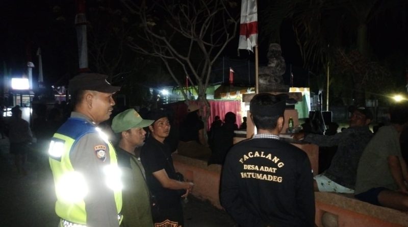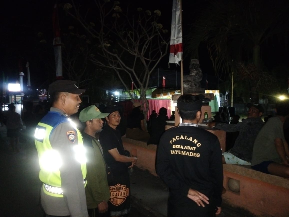 Polres Klungkung – Bhabinkamtibmas Desa Batumadeg Polsek Nusa Penida Aipda I Gede Agus Sujana bersama Linmas dan Pecalang Desa Adat Batumadeg melaksanakan pengamanan malam resepsi HUT ke-80 Kemerdekaan Republik Indonesia. Kegiatan berlangsung di Lapangan Desa Batumadeg, Nusa Penida, Klungkung, (17/8).