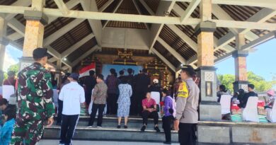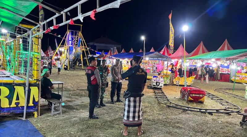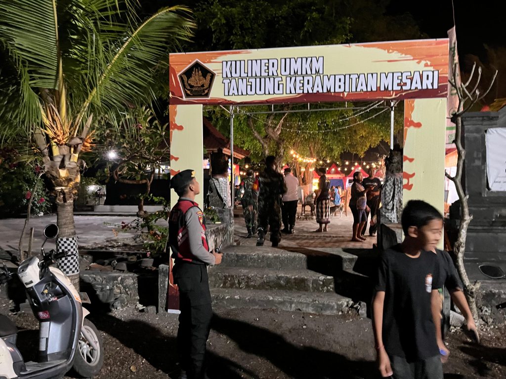 Polres Klungkung – Bhabinkamtibmas Desa Batununggul Aiptu Dewa Made Susila Dharma bersama personel Polsubsektor Pelabuhan Sampalan dan pecalang melaksanakan kegiatan pengamanan di lokasi kegiatan Kuliner UMKM Tanjung Kerambitan Mesari yang berlangsung di Desa Batununggul, Kecamatan Nusa Penida, Klungkung, (31/7).