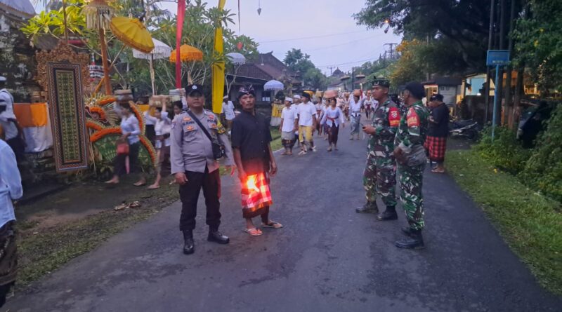 Polres Klungkung – Bhabinkamtibmas Desa Bungbungan Polsek Banjarangkan, Bripka I Gede Juliawan, bersinergi dengan Babinsa Desa Bungbungan serta pecalang Desa Adat Bungbungan melaksanakan pengamanan kegiatan persembahyangan Ida Batara Banjar Umanyar Desa Nyalian menuju Pura Dalem Agung Desa Adat Penarukan, Desa Bungbungan, Kecamatan Banjarangkan, Kabupaten Klungkung, dalam rangka Upacara Dewa Yadnya di Pura Dalem Agung, (13/1).