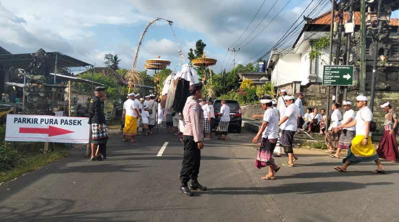 Bhabinkamtibmas Desa Aan Kawal Upacara Piodalan di Pura Dadia Agung Pasek Gelgel.