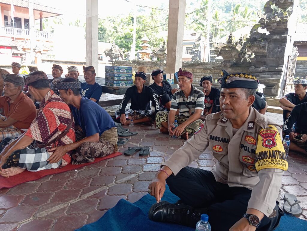 Klungkung – Bhabinkamtibmas Desa Besan, Polsek Dawan, Aiptu I Wayan Darsana menghadiri kegiatan Dharma Wacana Pitra Yadnya yang dilaksanakan di Dusun Kawan, Desa Besan, Kecamatan Dawan, Kabupaten Klungkung, (26/4).