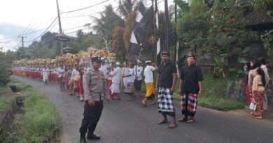 Banjarangkan – Bhabinkamtibmas Desa Negari Aiptu I Wayan Sudarma bersinergi dengan Babinsa Desa Negari dan Pecalang Desa Adat Negari melaksanakan atensi pengamanan kegiatan Upacara Dewa Yadnya (Pujawali) yang digelar di Pura Dalem Desa Adat Negari, Banjarangkan, Klungkung, (17/6).