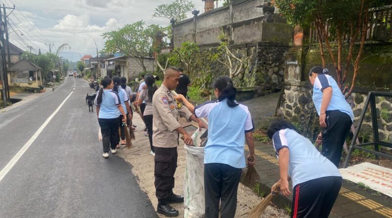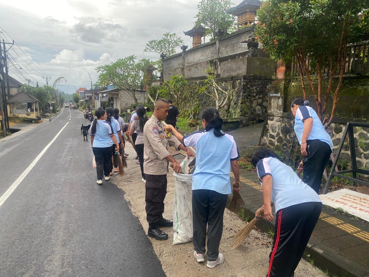 Polres Klungkung – Bhabinkamtibmas Desa Nyanglan Polsek Banjarangkan Aipda I Dewa Ketut Sukayasa mengikuti kegiatan Kulkul PKK yang direalisasikan melalui aksi bersih-bersih lingkungan bersama seluruh elemen masyarakat Desa Nyanglan, Kecamatan Banjarangkan, Kabupaten Klungkung, (2/1).