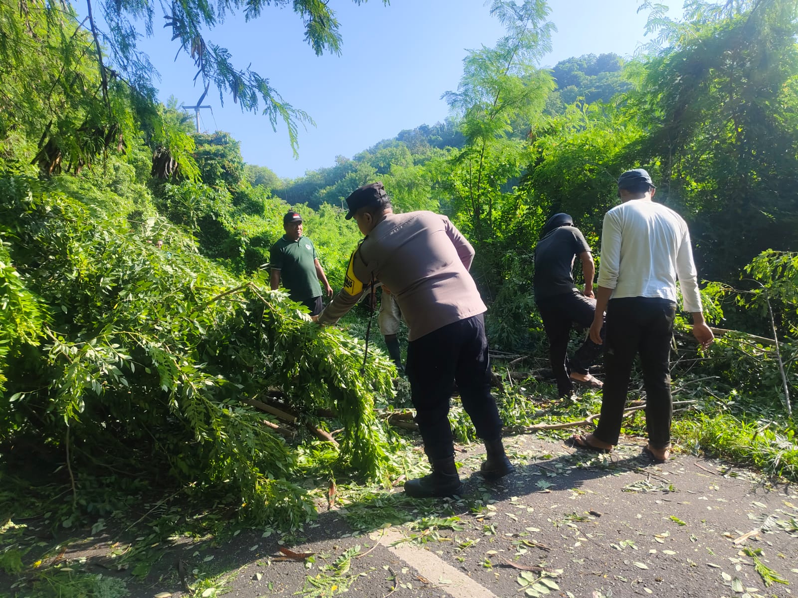Setelah menerima informasi dari warga, Bhabinkamtibmas segera menuju lokasi kejadian dan berkoordinasi dengan pihak perangkat desa. Dalam waktu singkat, tim gabungan langsung melakukan penanganan dengan pembersihan jalan melalui pemotongan serta pemindahan bagian pohon yang menghalangi badan jalan sehingga arus lalu lintas kembali normal.