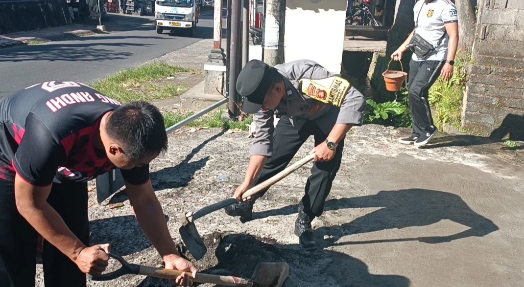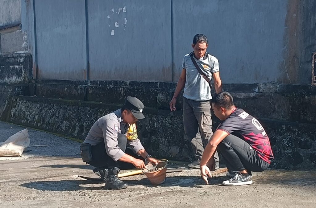 Polres Klungkung – Bhabinkamtibmas Desa Tohpati, Polsek Banjarangkan, Aiptu I Wayan Juliawan, S.H., bersama perangkat desa melaksanakan kegiatan gotong royong perbaikan jalan rabat beton yang mengalami kerusakan di wilayah Desa Tohpati, Kecamatan Banjarangkan, Kabupaten Klungkung, (17/4).
