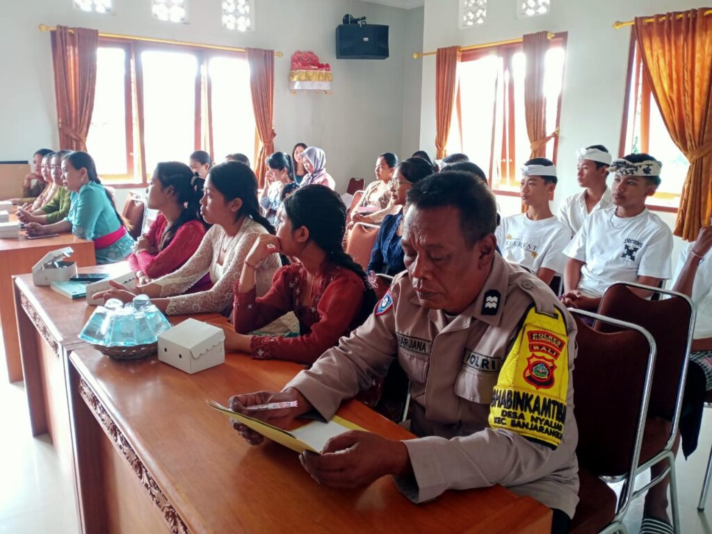 Bhabinkamtibmas (Bhayangkara Pembina Keamanan dan Ketertiban Masyarakat) desa Nyalian, Kecamatan Banjarangkan, Klungkung Aiptu Dewa Made Danarjana mengikuti kegiatan sosialisasi tentang Toxic Parenting di Kantor Desa Nyalian, Banjarangkan, Klungkung (11/9/2024).