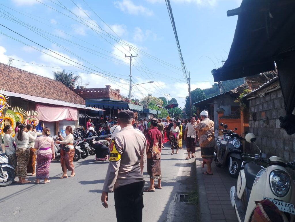 Bhabinkamtibmas yang hadir dalam kegiatan tersebut bersinergi dengan pecalang setempat melakukan pengaturan lalu lintas, karena acara pernikahan tersebut beberapa masyarakat parkir menggunakan badan jalan, sehingga dilakukan pengaturan untuk menjaga arus lalu lintas tetap lancar.