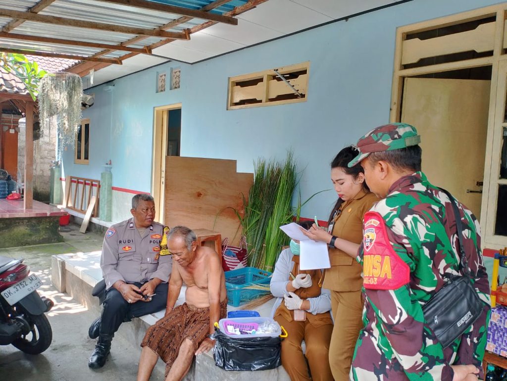 Bhabinkamtibmas desa Paksebali, Dawan, Klungkung Aiptu I Wayan Rudiastama mendampingi petugas dari Puskesmas Dawan II fdan Kader Poskesdes melaksanakan pemberian layanan kesehatan di Dusun Bucu, Desa Paksebali, Dawan, Klungkung (24/2/2025).