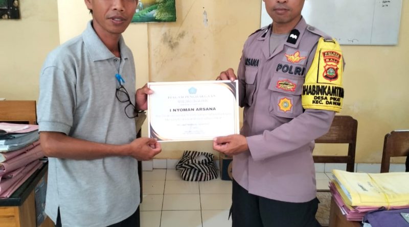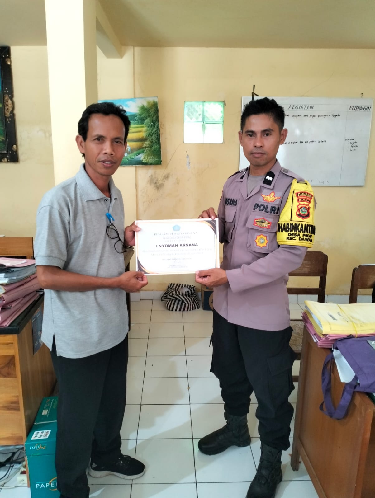 Klungkung – Sebagai bentuk penghargaan atas dedikasi dan kontribusi luar biasa dalam membangun kemitraan yang erat antara Polri dan masyarakat di tingkat desa, Bhabinkamtibmas Desa Pikat, Aipda I Nyoman Arsana, menerima Piagam Penghargaan “Apresiasi Desa Pikat”. Penghargaan tersebut diserahkan langsung oleh Pj. Perbekel Desa Pikat, I Nyoman Kardana, di ruang kerja Perbekel Desa Pikat (27/5).