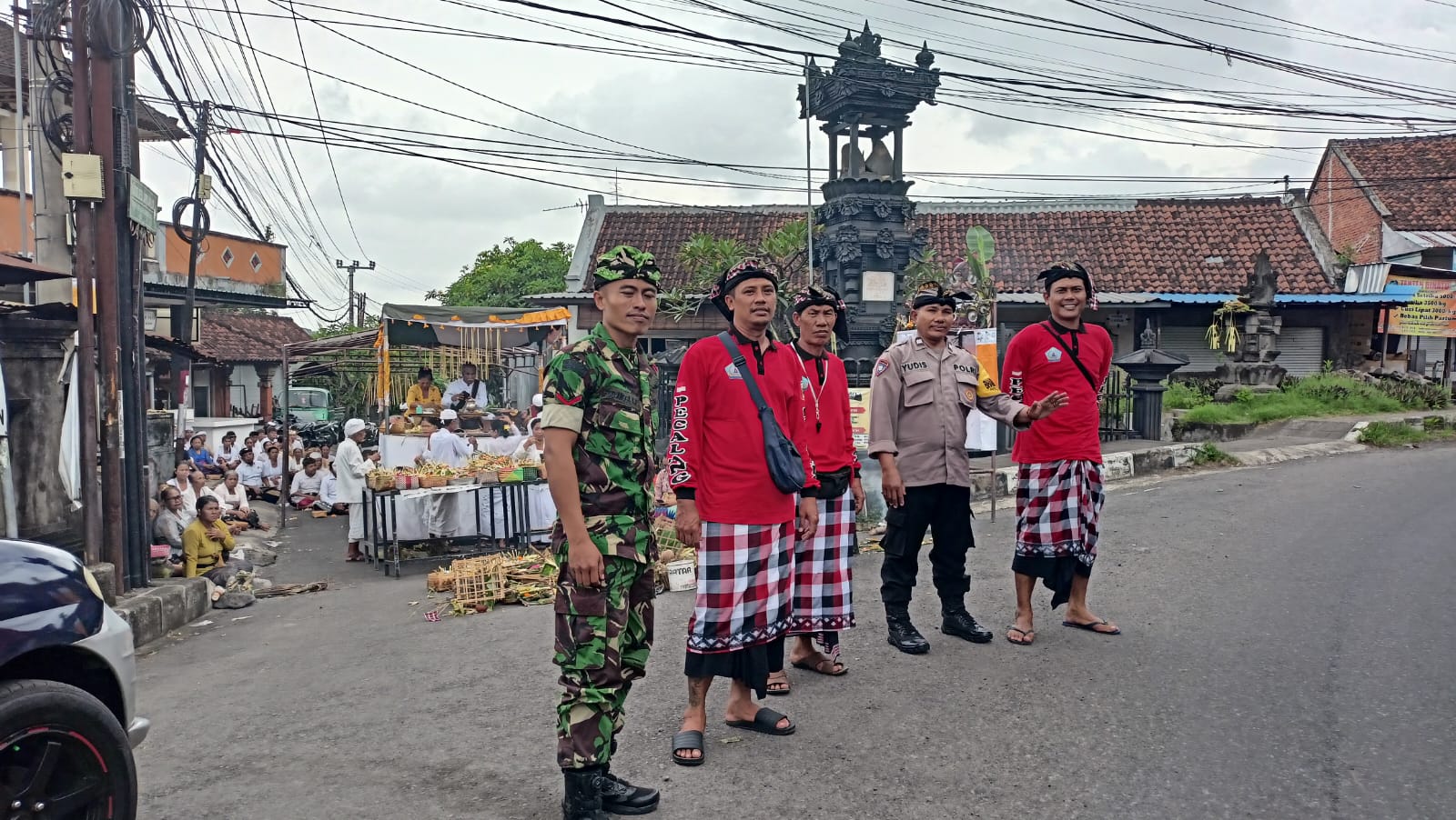 Polres Klungkung – Bhabinkamtibmas Desa Sampalan Klod, Polsek Dawan, Aiptu Yudis, melaksanakan pengaturan lalu lintas bersinergi dengan pecalang dalam rangkaian upacara Pecaruan Sasih Kapat yang digelar di wilayah Desa Sampalan Klod, Kecamatan Dawan, Klungkung, (30/9).