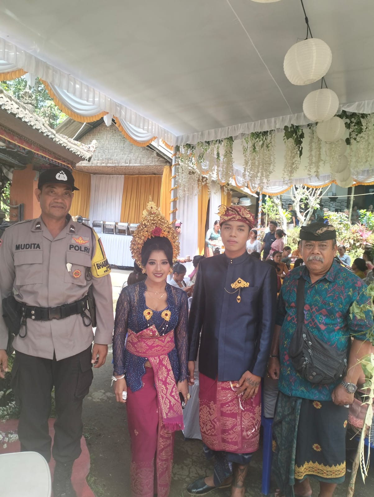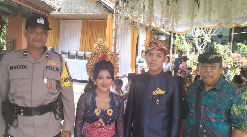 Polres Klungkung – Bhabinkamtibmas Desa Tegak, Polsek Klungkung, Aipda I Wayan Mudita menghadiri undangan pernikahan salah satu warganya di Dusun Tulang Nyuh, Desa Tegak, Klungkung. Kehadiran Bhabinkamtibmas dalam kegiatan masyarakat ini merupakan wujud nyata kedekatan sekaligus membangun kemitraan dengan warga binaan, (24/9).
