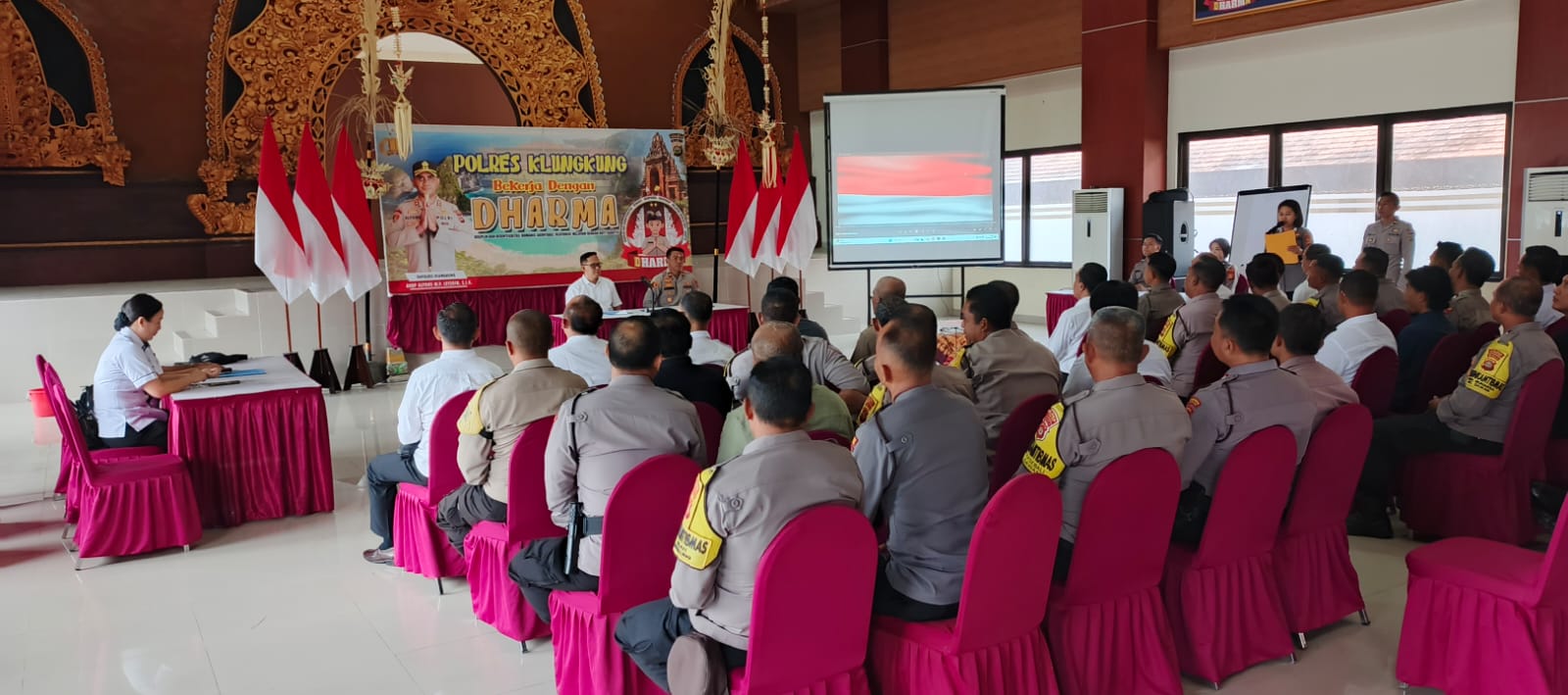Polres Klungkung menerima kunjungan dari Tim Bidang Hukum (Bidkum) Polda Bali dalam rangka kegiatan sosialisasi dan penyuluhan hukum. Kegiatan ini dilaksanakan di Aula Jalaga Dharma Pandhapa dihadiri Oleh Personel Polres Klungkung dan Polsek Jajaran. Senin, 19/5