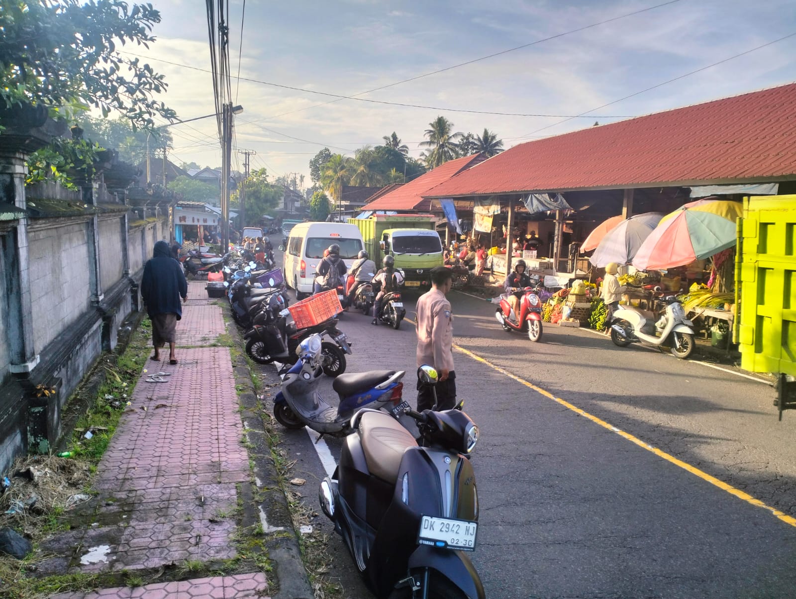 Polres Klungkung – Pagi yang ramai di Pasar Desa Tegak menjadi saksi dedikasi seorang anggota Bhabinkamtibmas Desa Tegak, Polsek Klungkung Aipda I Wayan Mudita yang dengan penuh tanggung jawab melaksanakan Strong Point pagi di simpang pasar guna mengatur arus lalu lintas dan membantu warga menyeberang, (11/11).