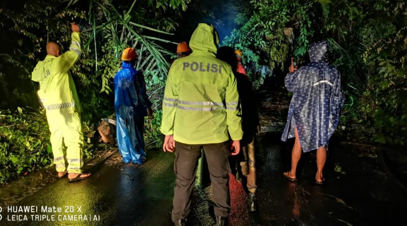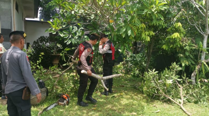 Polres Klungkung— Personel Polsek Dawan mendatangi lokasi bencana alam berupa pohon tumbang yang menimpa tembok pembatas Kantor PT Djarum Distributor