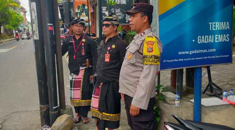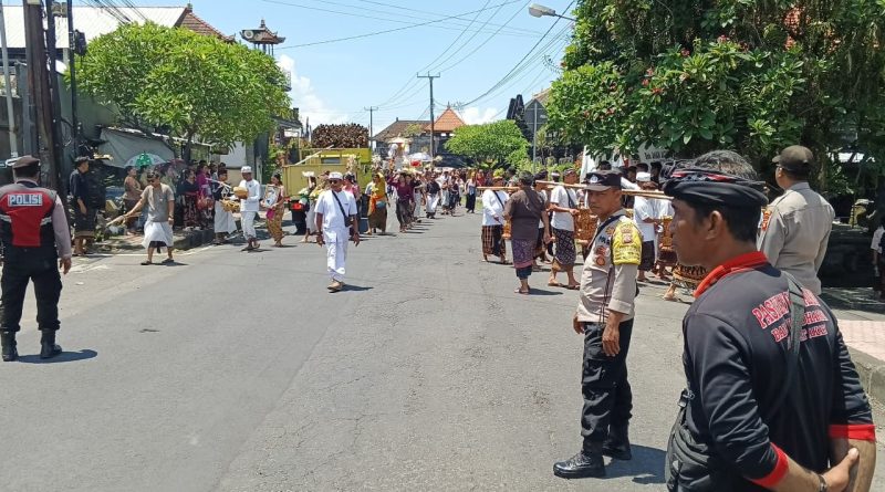 Polres Klungkung — Personel Pleton Siaga IV Polsek Klungkung melaksanakan kegiatan pengamanan dalam rangka upacara Pitra Yadnya yang berlangsung di