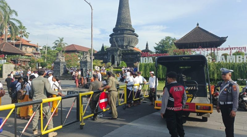 Personel Polsek Klungkung dari melaksanakan pengamanan dalam rangka kegiatan festival Bulan Bahasa Bali yang dilaksanakan di Monumen Puputan Klungkung, Klungkung