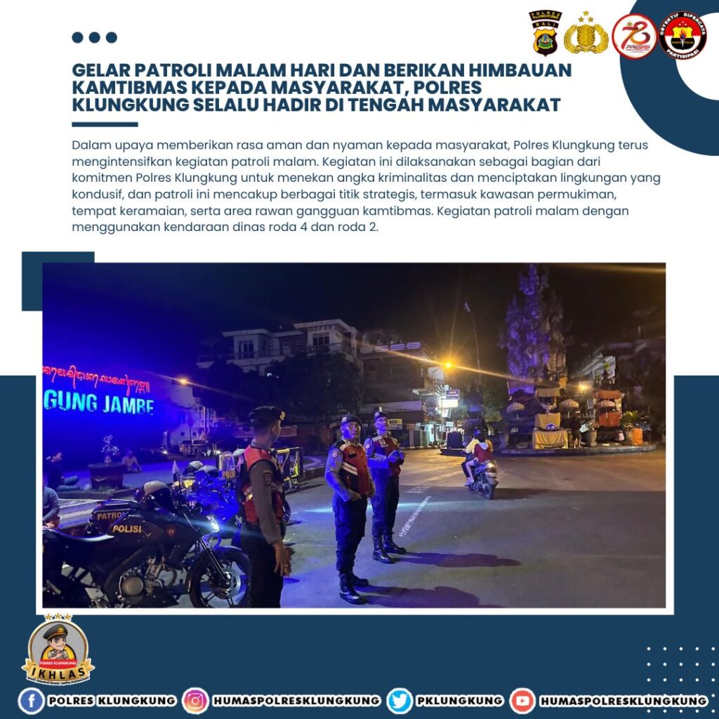 Gelar Patroli Malam Hari Dan Berikan Himbauan Kamtibmas Kepada Masyarakat, Polres Klungkung Selalu Hadir Di Tengah Masyarakat