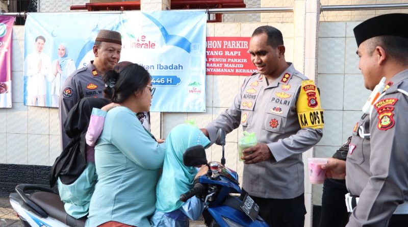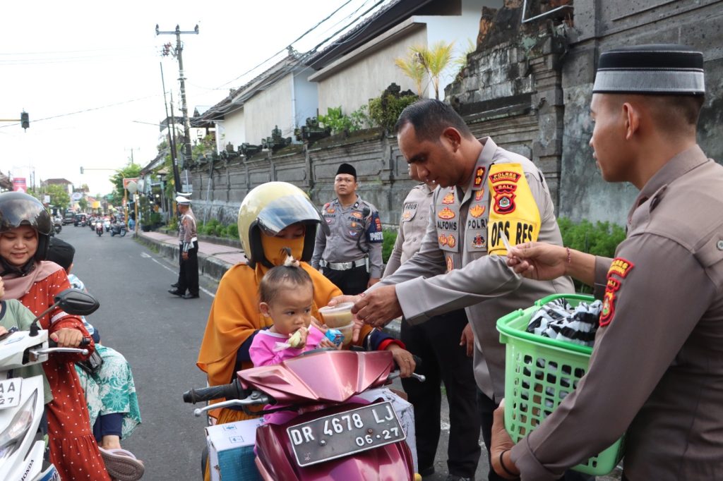 Kapolres Klungkung AKBP Alfons W P Letsoin, S.I.K., berbagi takjil dengan warga di depan Mesjid Al-Fatah, Kampung Jawa, serta Jalan Puputan, Klungkung (12/3/2025).