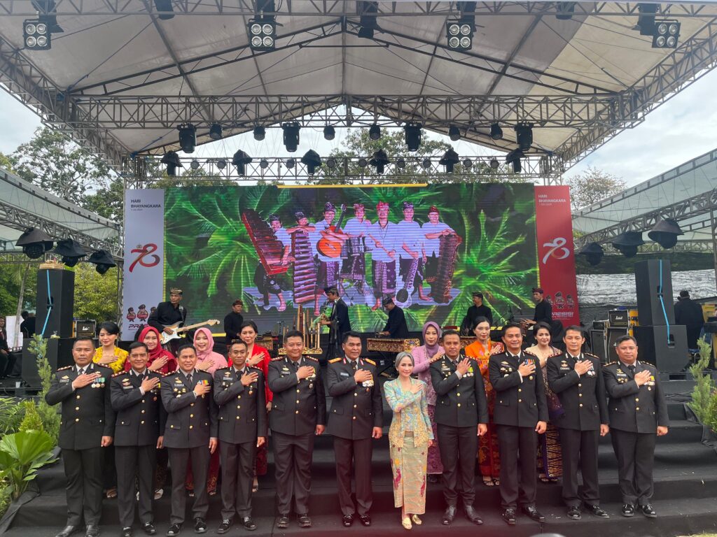 Kapolres Klungkung didampingi Ketua Bhayangkari Cabang Klungkung, Hadiri Puncak Peringatan Hari Bhayangkara Ke-78 di Lapangan Niti Mandala Renon Denpasar