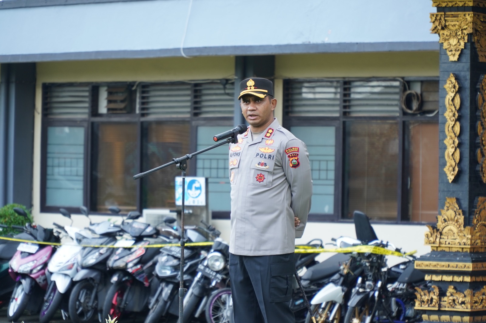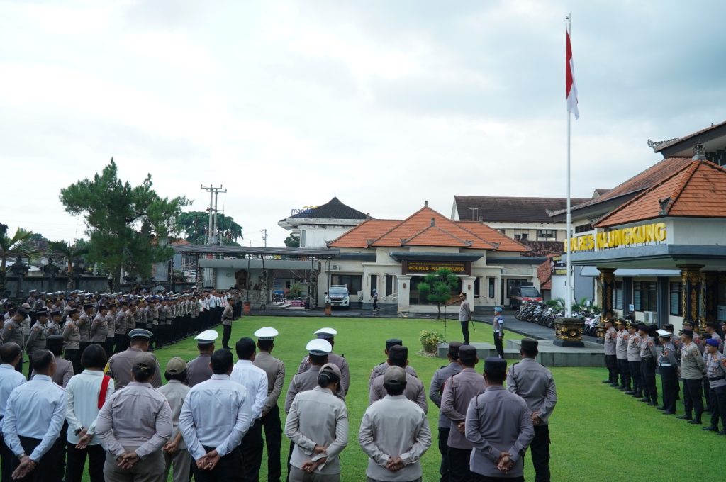 Kapolres Klungkung AKBP I Nengah Alfons W P Letsoin, S.I.K., memimpin langsung pelaksanaan apel jam pimpinan di Lapangan Apel Polres Klungkung pada Senin pagi (19/5).