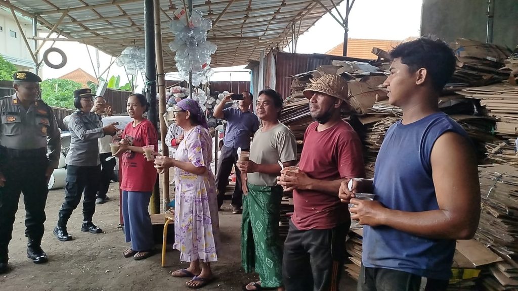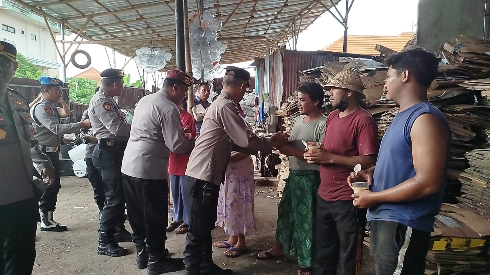 Kapolsek Klungkung Kompol I Gusti Putu Dharmanatha berbagi takjil dengan warga yang berlokasi di penimbunan rongsok, jalan Ngurah Rai, Klungkung (8/3/2025).