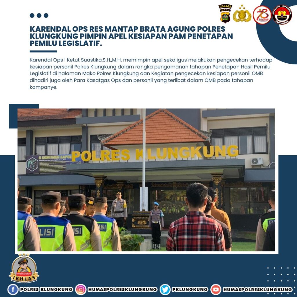 Kapolres Klungkung selaku Kaops Res Mantap Brata Agung Polres Klungkung AKBP Umar,S.I.K.,M.H. melalui Kabag Ops selaku Karendal Ops I Ketut Suastika,S.H.,M.H. memimpin apel sekaligus melakukan pengecekan terhadap kesiapan personil Polres Klungkung dalam rangka pengamanan tahapan Penetapan Hasil Pemilu Legislatif di halaman Mako Polres Klungkung,Selasa (18/6/2024)