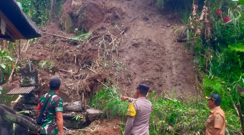 Longsor Rusak Pelinggih di Pura Manik Tirta Timuhun, Bhabinkamtibmas Timuhun Datangi Lokasi.