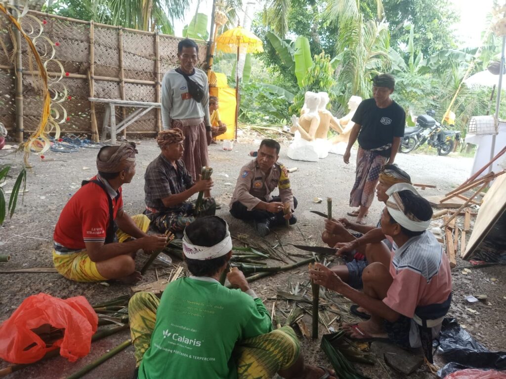 Seperti yang dilakukan oleh salah satu personel Bhabinkamtibmas kami Aiptu I Nengah Suarnaya ikut ngayah di dalam membuat perlengkapan sarana keagamaaan dimana nantinya di salah satu pura paibon di desa tersebut akan menggelar karya keagamaan yang puncak jatuh pada hari raya saraswati. Ujar Kompol Ida Bagus Putra Sumerta