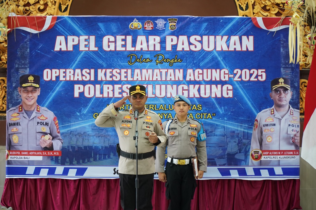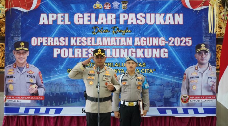 Saat Memimpin Apel Gelar Pasukan Kapolres Klungkung AKBP Alfons W.P Letsoin,S.I.K., membacakan amanat Kapolda Bali Pertama-tama marilah kita panjatkan puji syukur kehadapan Tuhan Yang Maha Esa atas berkat rahmatnya kita dapat melaksanakan apel gelar pasukan operasi Keselamatan Agung tahun 2025.
