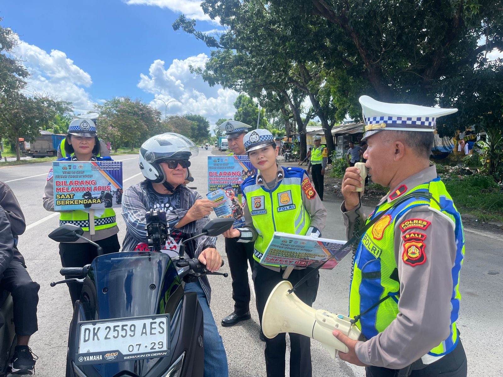 Polres Klungkung — Personel yang terlibat dalam Operasi Keselamatan Agung 2026 Polres Klungkung melaksanakan kegiatan simpatik dengan membagikan brosur imbauan keselamatan berlalu lintas kepada para pengguna jalan di Jalan Bypass Ida Bagus Mantra, tepatnya di Simpang Klotok, Kabupaten Klungkung, (5/2).