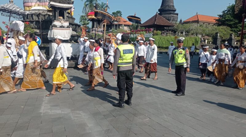 Klungkung – Personel pengamanan dari Polres Klungkung melaksanakan pengamanan kegiatan Upacara Melasti dalam rangkaian perayaan Hari Raya Nyepi Tahun Saka