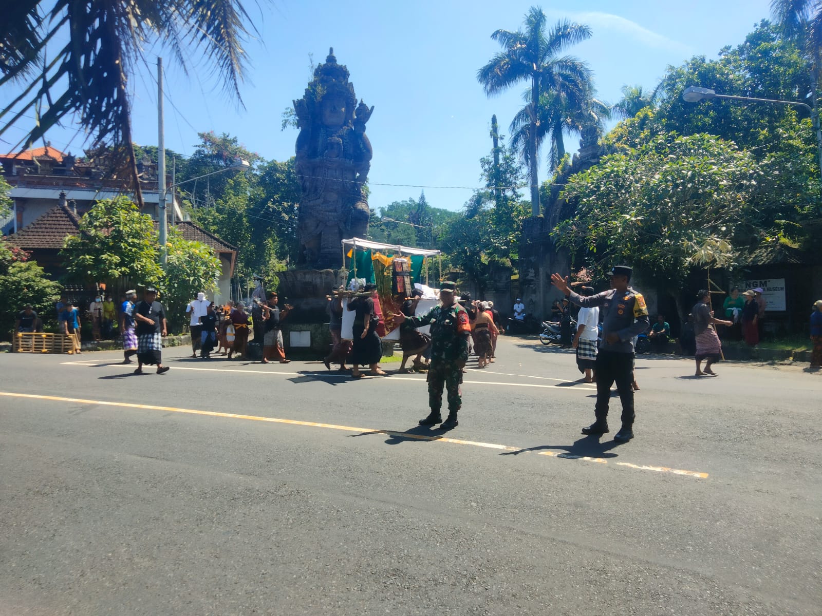 Polres Klungkung – Bhabinkamtibmas Desa Takmung Aiptu I Nengah Kariasa bersama Unit Lantas Polsek Banjarangkan, Babinsa Desa Takmung, dan Pecalang Desa Adat Umesalakan melaksanakan kegiatan pengamanan dan pengaturan lalu lintas dalam rangkaian Upacara Pitra Yadnya (Ngaben) yang dilaksanakan oleh salah satu warga di wilayah Desa Takmung, Banjarangkan, Klungkung, (4/8).