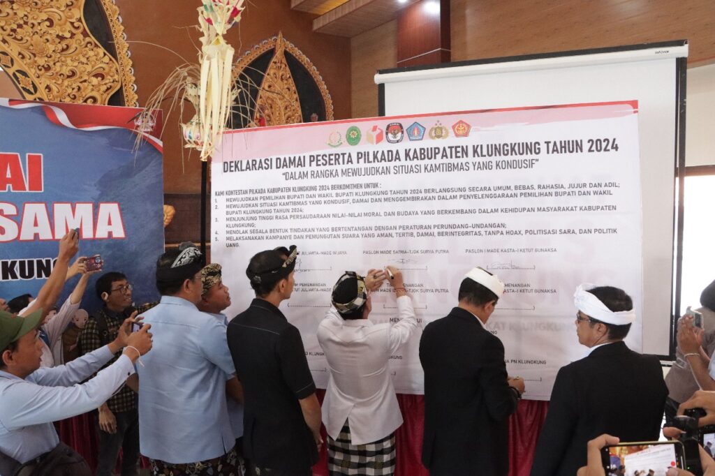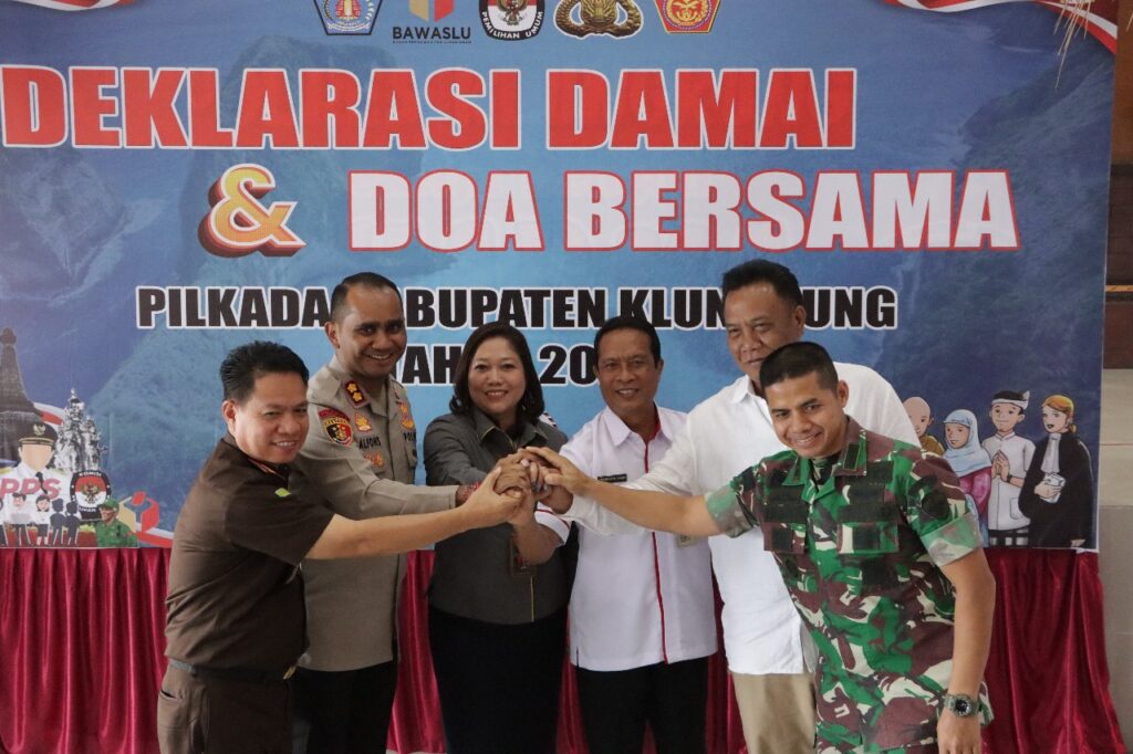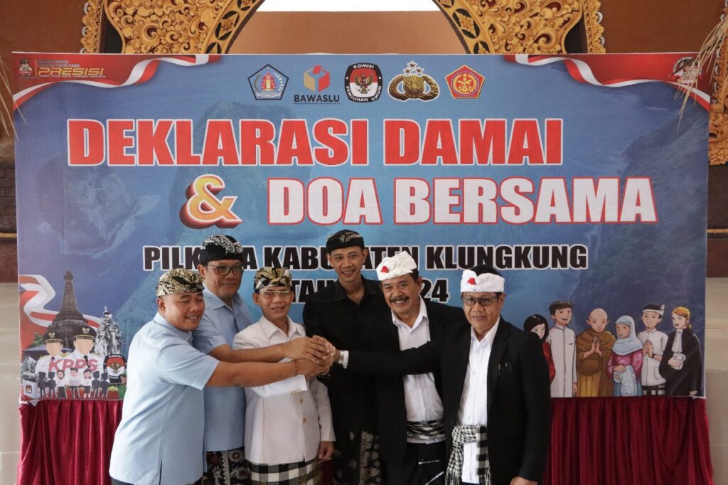 Polres Klungkung menggelar kegiatan Deklarasi Damai dan Doa Bersama dalam rangka Pilkada Kabupaten Klungkung Tahun 2024, di di Jalaga Dharma Pandapa Polres Klungkung, Klungkung (18/9/2024).
