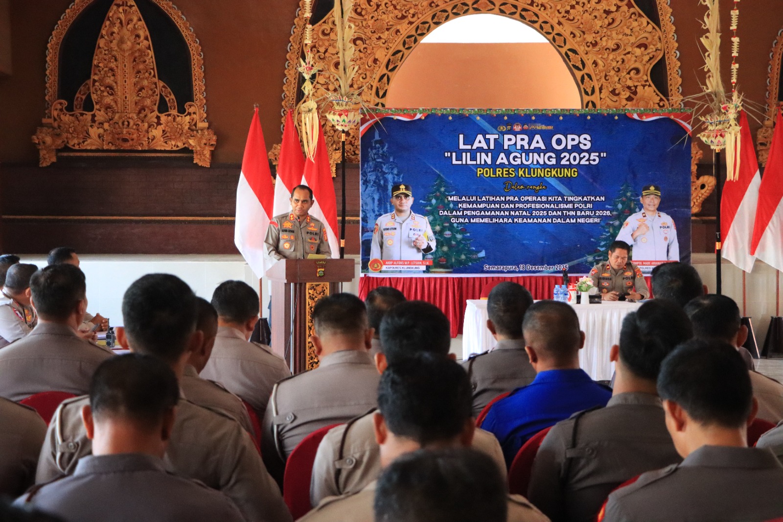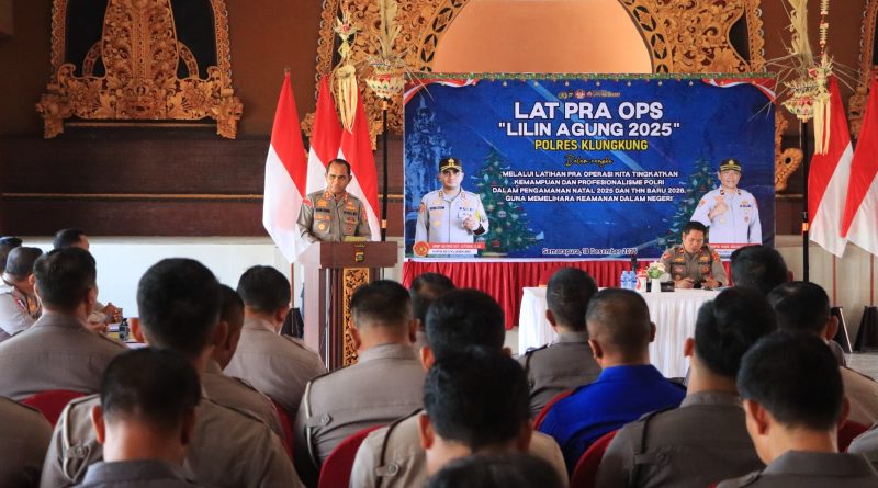 Polres Klungkung – Polres Klungkung melaksanakan Latihan Pra Operasi (Lat Pra Ops) Lilin Agung 2025 yang diselenggarakan di Gedung Dharma Jalaga Pandapha Polres Klungkung. Kegiatan ini dihadiri langsung oleh Kapolres Klungkung AKBP Alfons W. P. Letsoin, S.I.K., para pejabat Operasi Lilin Agung 2025, serta seluruh personel yang terlibat dan tersprint dalam Operasi Lilin Agung 2025, (18/12).