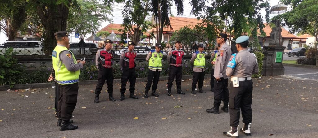Personel Polres Klungkung yang terlibat dalam Operasi Mantap Praja Agung 2024 melaksanakan pengamanan kegiatan simakrama sekaligus gotong royang kebersihan Paket Astaguna I Made Kasta – Ketut Gunaksa di Pura Goa Lawah, Desa Pesinggahan, Dawan, Kabupaten Klungkung (6/10/2024).