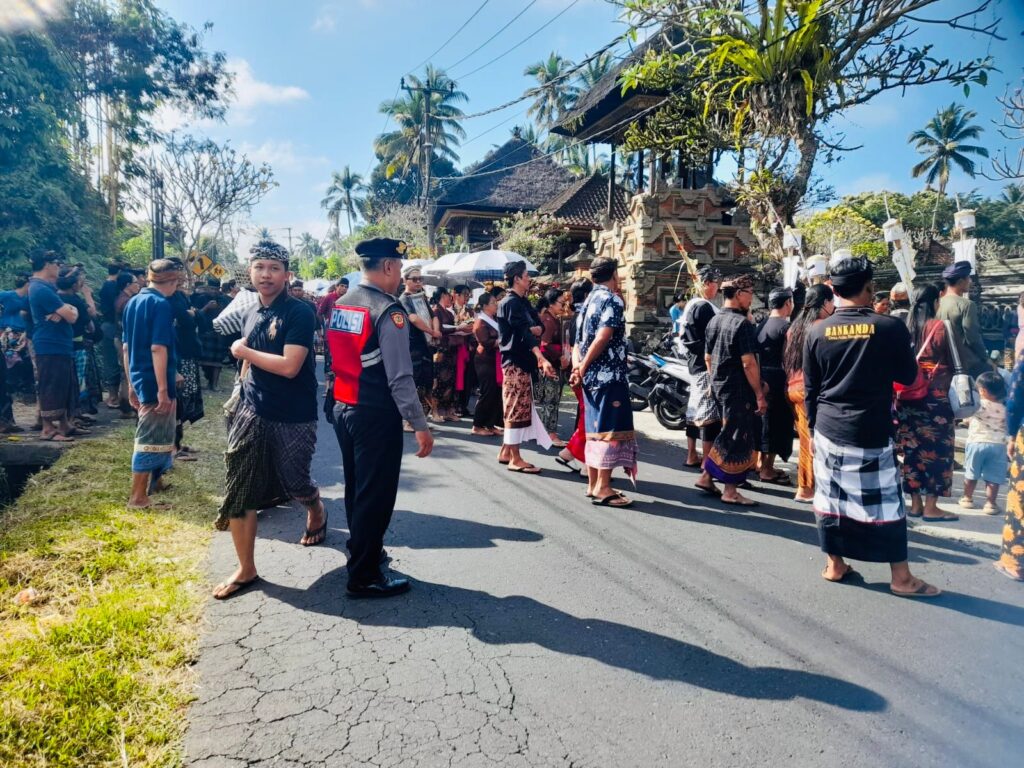 Personel Polsek Banjarangkan melaksanakan pengamanan kegiatan upacara adat Ngebet yang merupakan rangkaian kegiatan upacara Pitra Yadnya ( Ngaben Masal ) di Desa Bungbungan, Banjarangkan, Klungkung (20/8/2024).