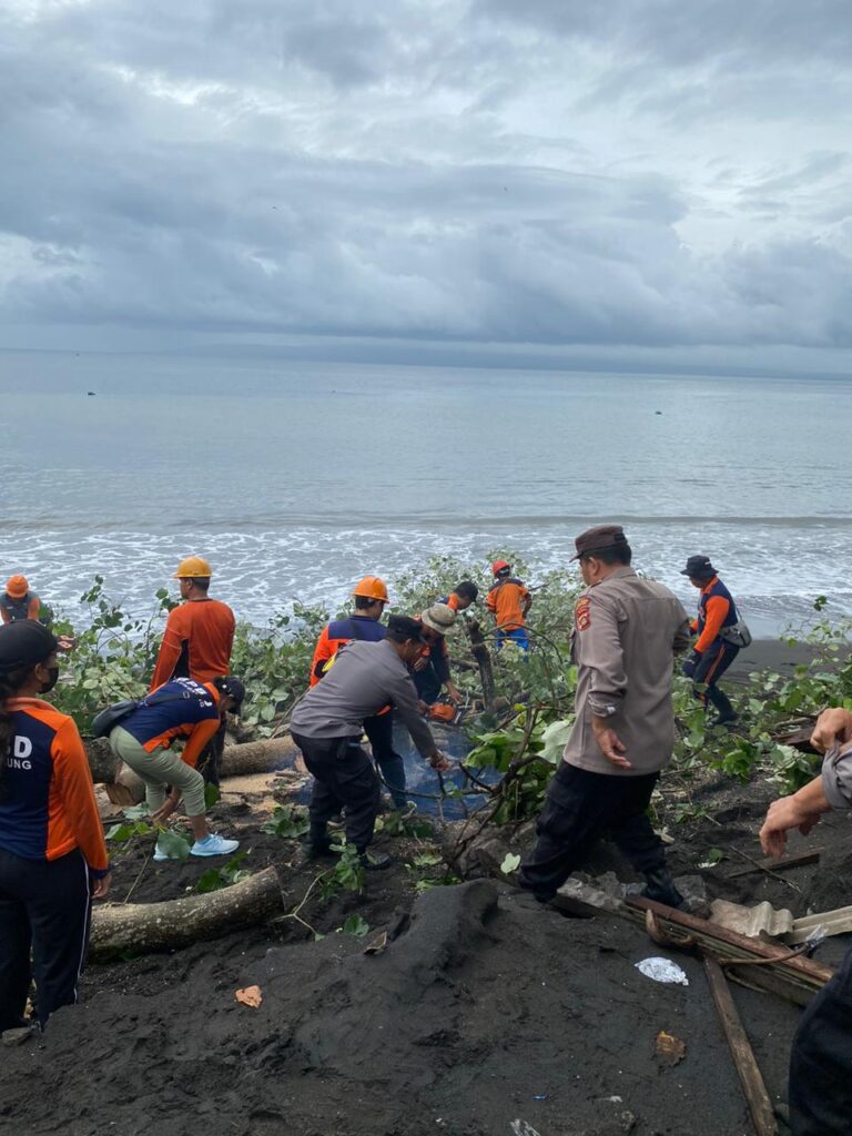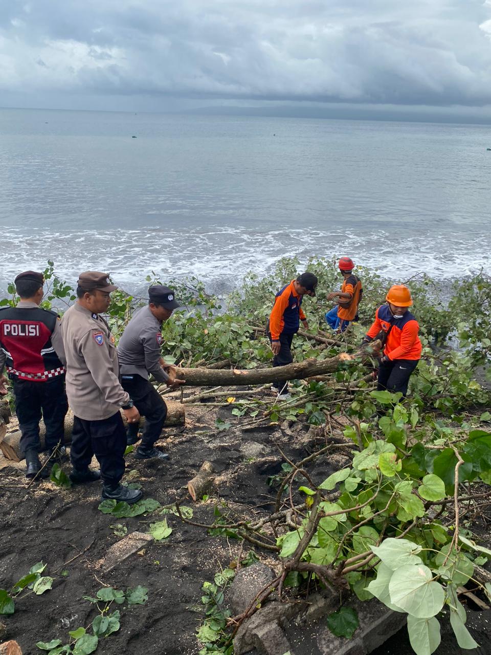 Personel Polsek Dawan bersinergi dengan petugas BPBD Kabupaten Klungkung melakukan penebangan pohon yang telah tumbang, serta persiapan pemotongan pohon ketapang lainnya yang kondisinya sudah rawan akibat terjangan ombak laut dan dilanjutkan dengan membersihkan hasil penebangan yang dilakukan secara bersama sama oleh petugas BPBD, Personel Polsek Dawan dan Masyarakat setempat.
