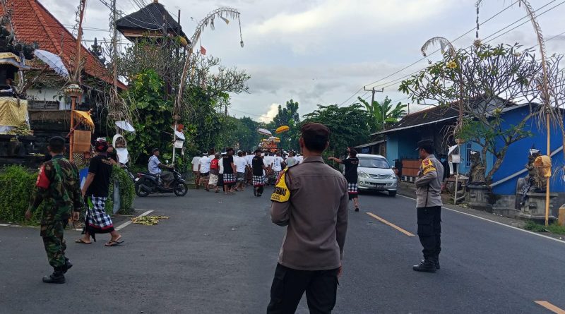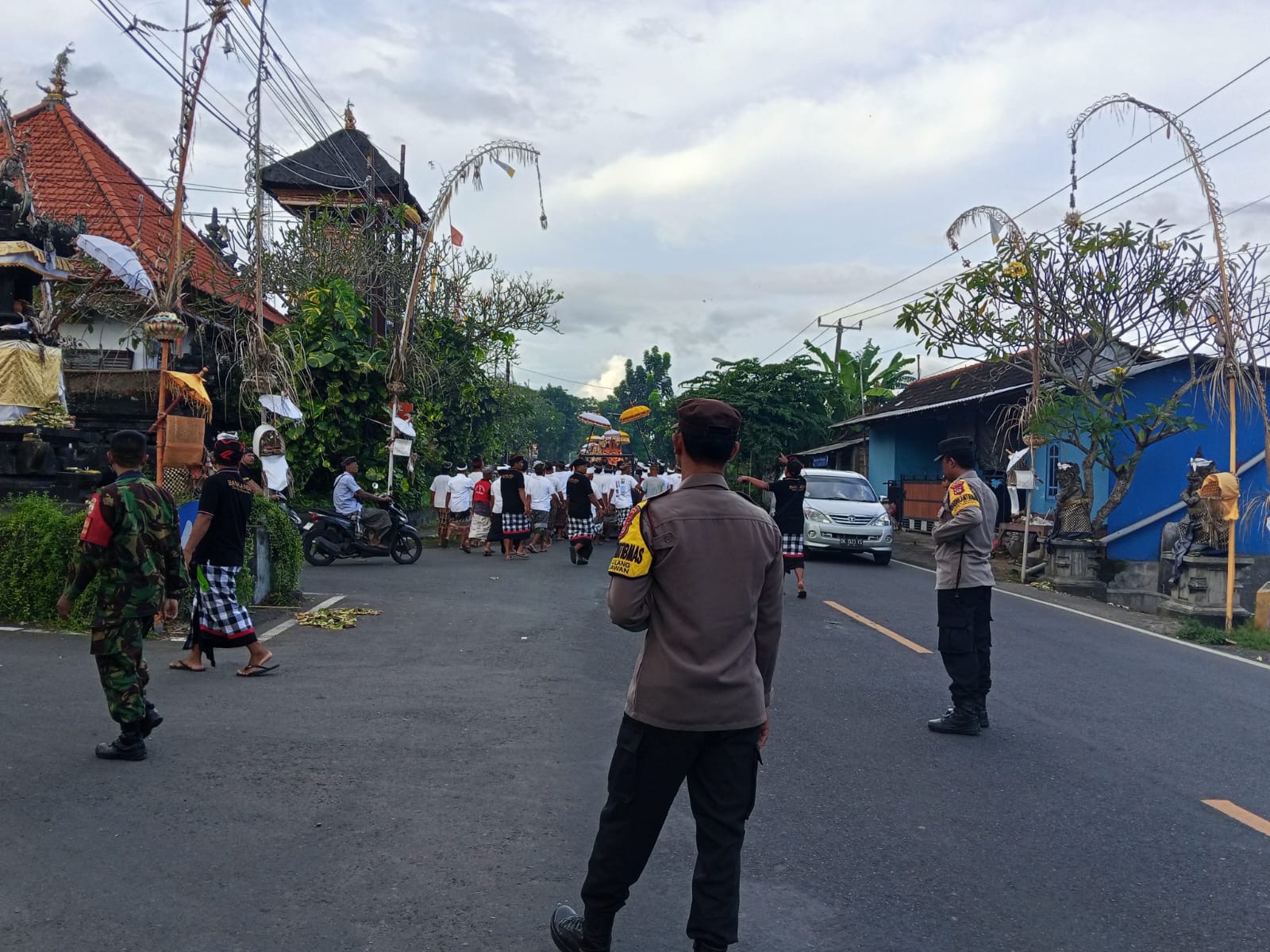Personel Polsek Dawan, Polres Klungkung, melaksanakan pengamanan kegiatan keagamaan Upacara Nedunang Ida Bethara Pura Goa Lawah, Desa Pesinggahan, Kecamatan Dawan, Kabupaten Klungkung, (12/5).