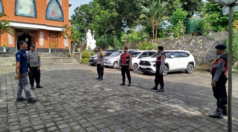 Polres Klungkung — Personel Polsek Klungkung bersinergi dengan Polres Klungkung melaksanakan pengamanan persembahyangan umat Kristen yang berlangsung di Gereja Pantekosta dan Gereja Santa Sisilia, (23/11).