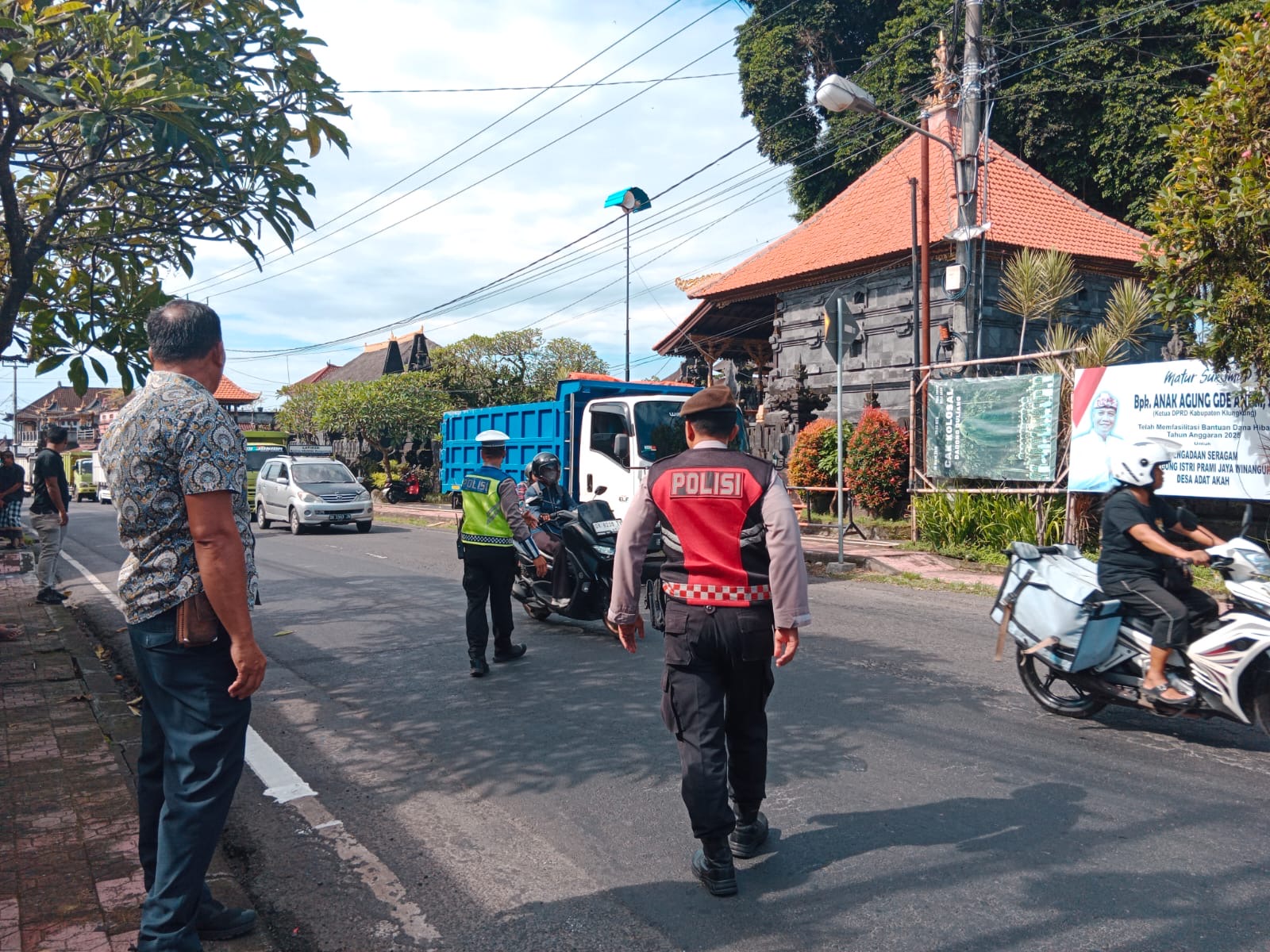 Personel Polsek Klungkung tampak melakukan pengaturan lalu lintas di sepanjang jalur yang dilalui iring-iringan upacara, sekaligus melakukan pengamanan terbuka guna mengantisipasi potensi gangguan kamtibmas.