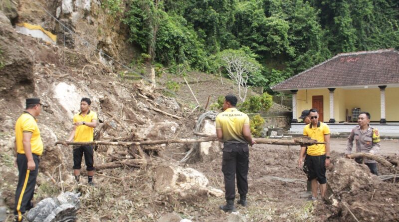 Polres Klungkung – Aparat Polsek Nusa Penida menunjukkan respons cepat dalam penanganan dampak bencana tanah longsor yang melanda kawasan Pura Ulun Danu Penida, Banjar Penida, Desa Sakti, Kecamatan Nusa Penida, Kabupaten Klungkung, dengan melaksanakan kegiatan pembersihan material longsoran