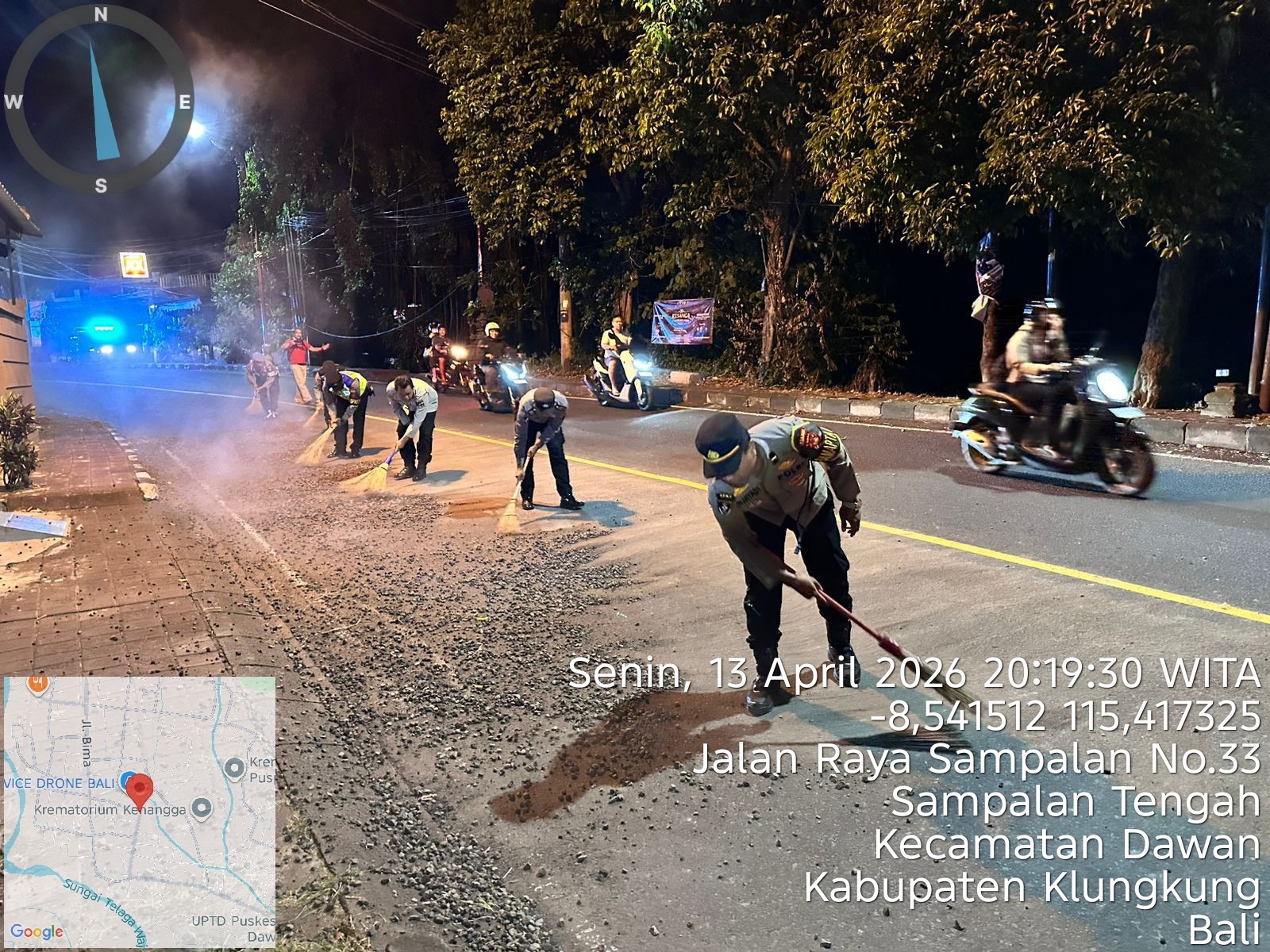 Polres Klungkung – Menindaklanjuti aduan masyarakat melalui layanan call center Polri 110, personel Polres Klungkung bersama Polsek Dawan bergerak cepat melakukan pembersihan ceceran material koral di jalan raya wilayah Desa Sampalan Tengah, Kecamatan Dawan, Kabupaten Klungkung, (13/4).