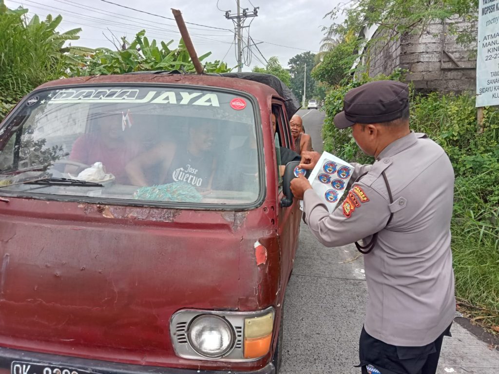 Subsatgas Binluh Satgas Preemtif Operasi Keselamatan Agung 2025 Polres Klungkung memberikan himbauan tertib berlalu lintas di simpang empat Tegal Besar, Bypass Ida Bagus Mantra, Banjarangkan, Klungkung (14/2/2025).