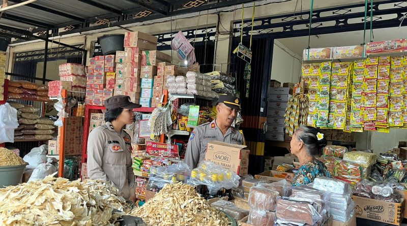 Personel Subsatgas Binmas Polres Klungkung yang terlibat dalam rangka cipta kondisi pasca perayaan Natal dan Tahun Baru 2025 melaksanakan kegiatan sambang kepada para pedagang di Pasar Galiran, Klungkung (3/1/2025).