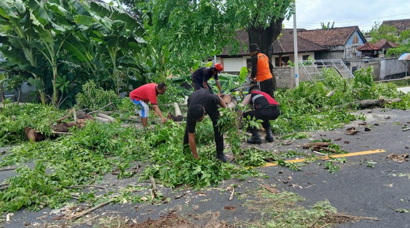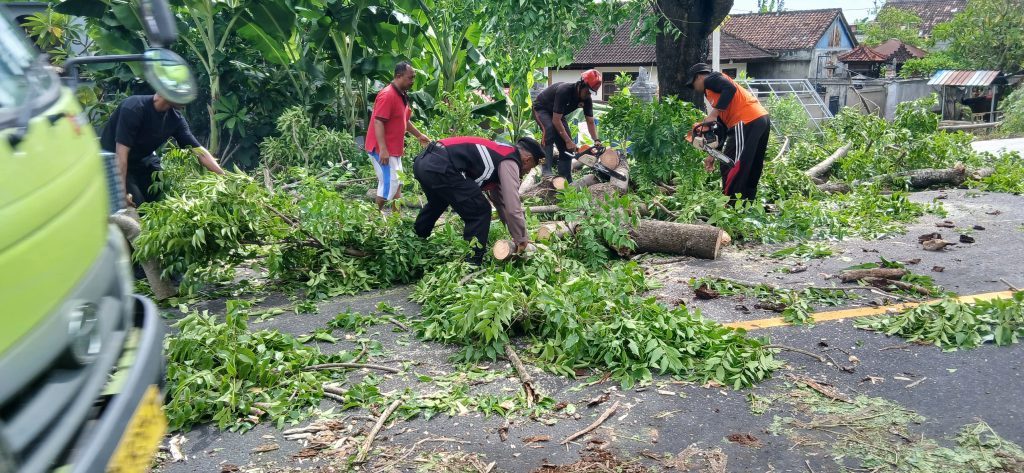 Personel Polsek Dawan bergerak cepat mendatangi lokasi pohon yang tumbang melintang di jalan juga menghalangi sebagian badan jalan di jalan Raya Gunakasa, Dawan, Klungkung (8/2/2025).